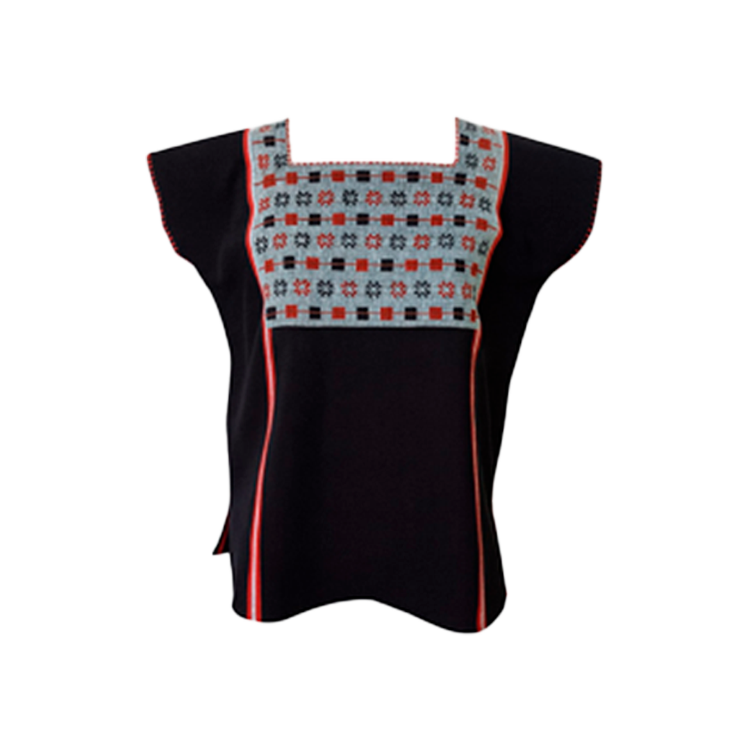 Blusa tradicional de San Juan Cancuc, elaborada en telar de cintura con hilos de algodón en tonalidad negra, símbolo de sobriedad y profundidad en la vestimenta tseltal. Al frente destaca un brocado geométrico en tonos gris, naranja y negro, dispuesto en franjas horizontales que representan el orden, la armonía y la continuidad de la vida comunitaria.