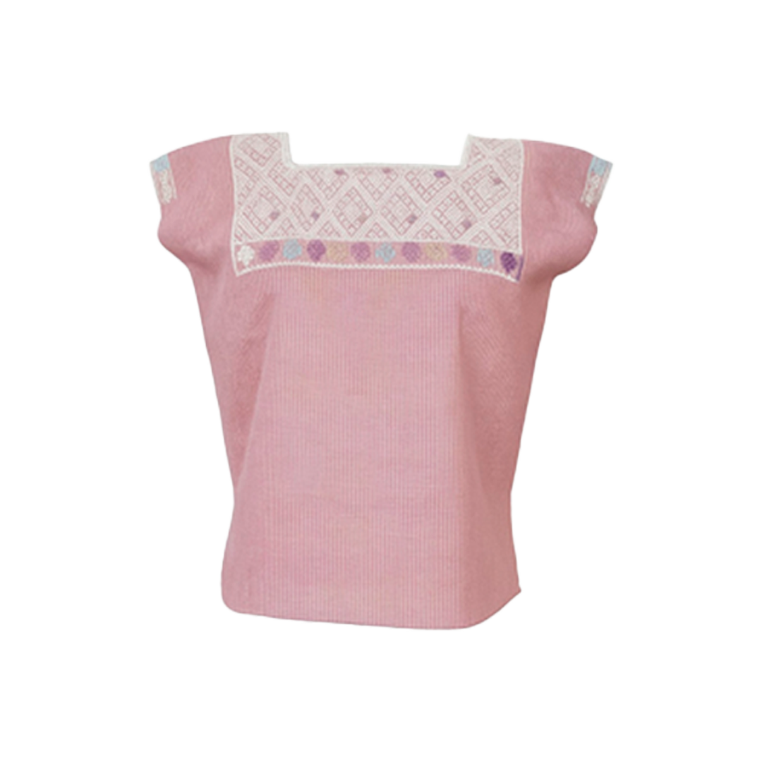 Este huipil tradicional de Aldama tejido en hilos de algodón, presenta una base en tonalidad rosa suave, símbolo de armonía y equilibrio, que aporta una estética sobria y contemporánea sin perder su raíz cultural.