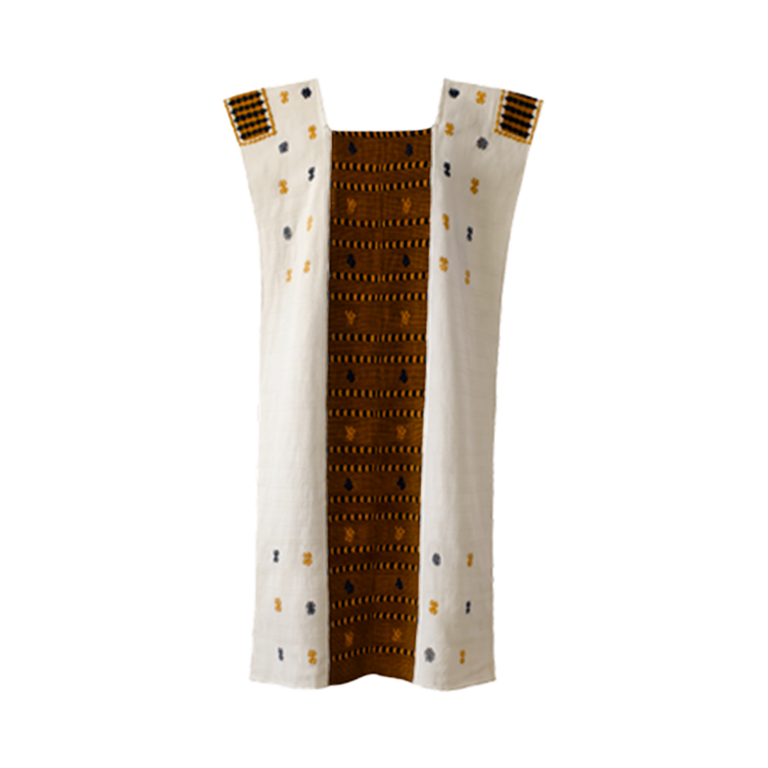 Este vestido de Pantelhó, Chiapas, con base blanca, centro en tonos tierras, transmite sobriedad, raíces profundas y elegancia ancestral.