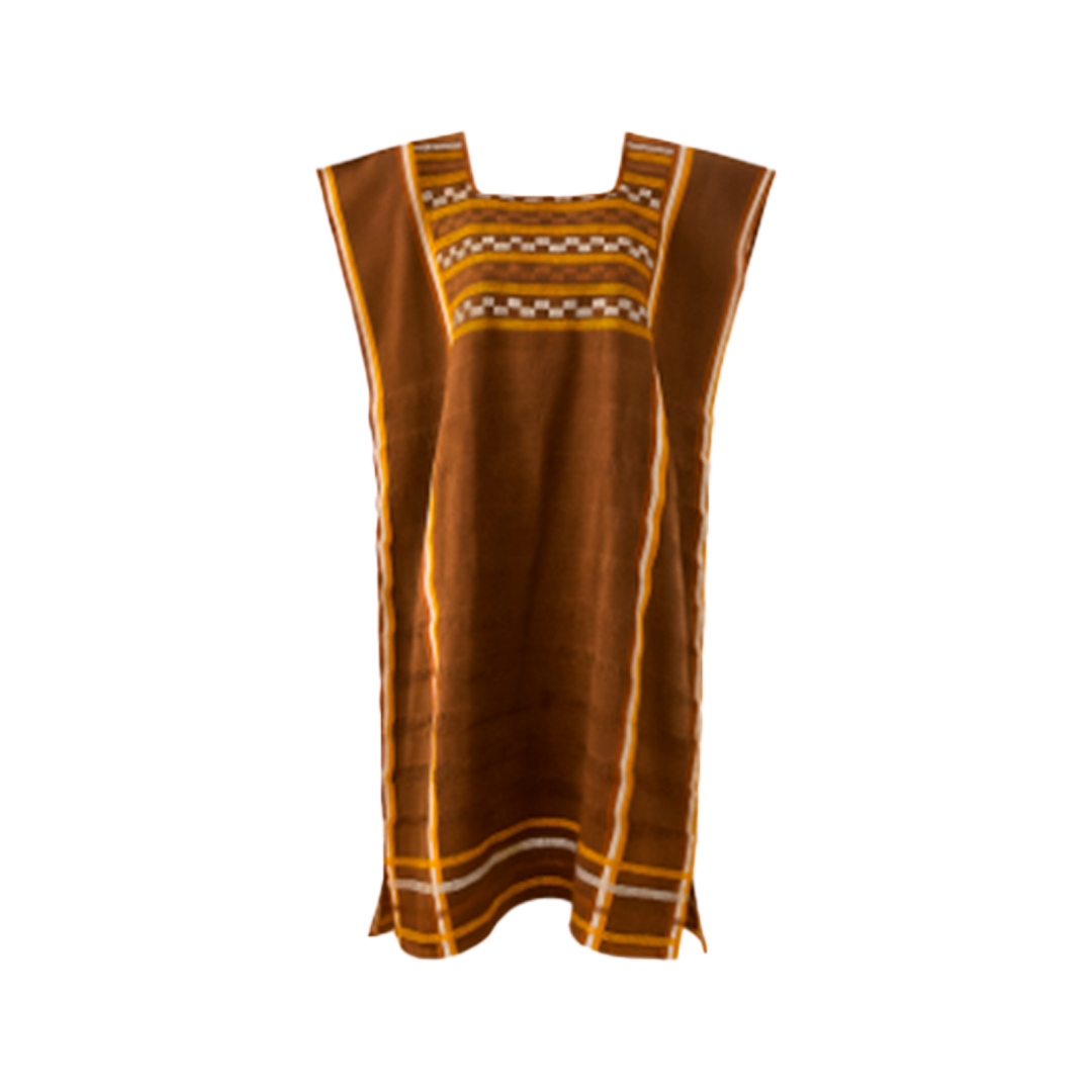 Vestido deshilado de algodón, elaborado artesanalmente en San Juan Cancuc. Su diseño en tonos café y oro combina tradición y estilo contemporáneo, creando una prenda ligera, fresca y versátil, ideal para cualquier ocasión.